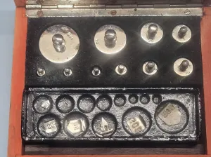 This is a set of 16 antique or vintage laboratory calibration weights ranging from 5mg to 100g. The set includes weights of 5mg, 20mg, 20mg, 100mg, 200mg, 500mg, 1g, 1g, 1g, 2g, 5g, 10g, 10g, 20g, 50g, and 100g. Each weight has been verified on a precision balance with an accuracy of 0.0001g (0.1mg), as demonstrated in the accompanying photograph. This set is housed in a classic wooden box, although the weights are currently uncalibrated.