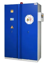 The LITHIUMSAFE 120.Z with FPC by Chemisafe is a state-of-the-art safety cabinet designed to store lithium batteries securely. Manufactured in Italy, it adheres to EN 14470-1 and EN 16121 standards, ensuring optimal safety. Constructed from robust electro-galvanized steel with anti-acid epoxy coating, it features high-temperature insulation and a fireproof structure. Key characteristics include automatic door closure at 47°C, key-locked doors, and maintenance-free air duct closures. The cabinet also incorporates an advanced automatic fire extinguisher system that mitigates fire damage by neutralizing hazardous decomposition products. Equipped with LPCB-certified fire detection and suppression, this cabinet offers programmable features for efficient and flexible use, making it a reliable choice for safe lithium battery storage. Recommended accessories include charging points with multiple sockets.