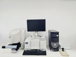 The Perkin Elmer Spectrum One FTIR Spectrometer coupled with the Spotlight Imaging System, formerly part of a university lab, is available as a spares/repairs item. It powers on and is in good cosmetic condition, though prior usage indicates maintenance needs, particularly with the analyte column. This instrument requires regular maintenance such as flushing the column to prevent crystallization and ensure consistent performance. While it provides high analytical capabilities, it is recommended for users familiar with such systems due to its maintenance requirements. Included in this system are: