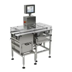 DWM H2 checkweigher assures the highest quality and accuracy of weighing. It is intended for integration with multi-track packaging machines transporting products to the line using several parallel tracks. It is possible to integrate the DWM H2 checkweigher in systems which due to the required throughput demand use of multiple checkweighers. The scale is equipped with multiple tracks integrated into one construction, the tracks are operated via one operation panel. Each of the weighing tracks is an independent measuring system equipped with a weighing module and rejecters. The weighing tracks are placed next to each other. With this, products can be picked up directly from the packaging machine.