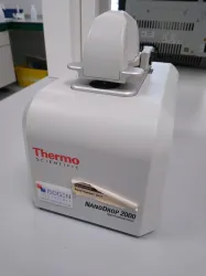 Introducing the pre-owned Thermo Scientific NanoDrop 2000 UV-VIS Spectrophotometer, a reliable instrument for accurately quantifying and evaluating the purity of nucleic acids, proteins, and other biomolecules. This microvolume spectrophotometer features proprietary sample retention technology that allows measurement of extremely small sample volumes, starting at just 0.5 μL.