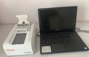 UV-Vis Thermo Scientific NanoDrop 8000 Microvolume enables quick and easy quantification of nucleic acids and proteins. Ideal for higher throughput applications, the NanoDrop 8000 can measure multiple samples simultaneously using only 1-2 µL of sample. Using an 8-channel sample dispensing pipette on a linear rack system, you can easily measure 96 samples in less than six minutes. Characteristics: Designed for micro-volume samples (1 μL). No dilution is required, even for highly concentrated samples Direct, easy measurements from tubes or 96-well plates It can measure multiple samples in one measurement cycle, up to eight samples simultaneously Single sample mode Pre-configured methods for common applications such as nucleic acid, protein A280, microarray, protein and labels, Pierce 660, Bradford, BCA, Lowry and more User-friendly software for creating custom methods and options for designing reports and exporting data The patented sample storage system eliminates the need for cuvettes Full spectrum (220 to 750 nm) Calculates sample purity factors (260/280) Technical data: Absorbance accuracy 3% (at 0.74 Abs at 350 nm) Detector type Linear silicon CCD array composed of 2048 elements Wavelength accuracy ±1 nm Absorbance range 0 – 75 Abs Accuracy 0.003 *SD from 10 single measurements at 0.74Abs Accuracy (absorption) 3% (at 0.74 at 350 nm) Applications Nucleic acid, protein, cell culture and custom methods Compatibility Professional versions of Microsoft™ Windows™ 7 (32-bit and 64-bit), Windows Vista (32-bit) and Windows XP (32-bit). USB knowledge Detection limits 2.5 ng/µL (dsDNA), 0.15 mg/ml (BSA) Detection range 2.5-3700 ng/µL (dsDNA), 0.15 – 100 mg/ml (BSA) Cszfeih27 Footprint 9.45″ x 12.6″ (24 x 32 cm) Lamp Xenon flash Measurement time