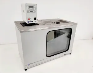 The PSL Rheotek TCB 8 is a temperature-controlled viscometer bath, designed to ensure precise and reliable viscosity measurements. Previously utilized in a university laboratory, the unit remains in excellent working condition, especially the heating function. The interior tank dimensions measure 59 cm long, 31 cm wide, and 37 cm high, providing ample space for a range of viscometric applications. While maintaining good cosmetic integrity, it features some minor markings from prior usage. Ideal for research and academic settings, it offers efficient temperature regulation essential for accurate experimentation.