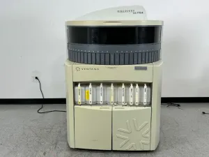 The Ventana Discovery Ultra Multiplex Staining System is an automated instrument designed to perform high-throughput multiplex immunohistochemistry (IHC) and in situ hybridization staining. Equipped to handle complex tissue staining protocols, it supports simultaneous detection of multiple biomarkers on a single tissue slide, enhancing throughput in pathology and molecular diagnostics.
