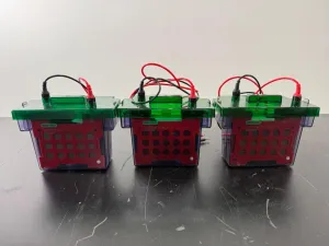 The Bio-Rad Criterion Blotter set includes three compact units designed primarily for protein transfer and blotting in electrophoresis workflows. These blotters facilitate efficient protein transfer onto membranes, supporting Western blotting procedures commonly used in molecular diagnostics, biotechnology, and biomedical research. Each blotter’s design enables consistent and uniform blotting, critical for reproducible results in protein expression analysis and bioprocessing workflows.
