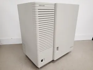 The Perkin Elmer ABI Prism 377 is a DNA sequencer known for its reliability and precision in genetic analysis. Previously part of a university lab, this unit is in good cosmetic condition and powers on successfully, utilizing an in-house power cable. It features multiple fans and functional front indicator lights. A flashing amber/yellow light at the end of the startup process suggests a potential connection issue with a control PC, however, due to the absence of a user manual, this cannot be confirmed.