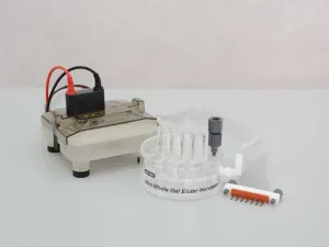 The Bio-Rad Mini Whole Gel Eluter is an electrophoretic system designed for electro-elution, enabling simultaneous elution and collection of multiple biomolecular bands from whole preparative polyacrylamide gels. This system eliminates the need for manual gel cutting and separate elution, by eluting all biomolecules directly into liquid fractions.