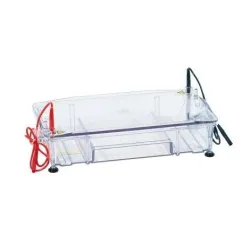The Hoefer HE99X Max Horizontal Agarose Electrophoresis Unit is designed for superior nucleic acid fragment separation, accommodating sizes from 100 bp to 20 kbp. This versatile unit includes three interchangeable tray sizes (15 x 20 cm, 15 x 15 cm, and 15 x 10 cm), ensuring adaptability for various gel sizes. It features self-locating/centering guides for consistent tray placement and gel anchor feet to prevent the gel from moving during runs. The unit offers a range of comb sizes for tailored sample throughput and adjustable comb heights for precise well depth control. With a maximum buffer volume of 1.2 liters and power settings of 200 V, 100 mA, and 20 W, it can handle up to 60 samples simultaneously. The HE99X operates efficiently within a temperature range of 4 to 40°C and up to 80% humidity. Overall dimensions are 14.17 x 5.51 x 7.17 inches (36 x 14 x 18.2 cm), making it a compact and efficient choice for high-resolution electrophoresis.