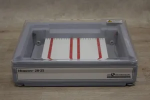 The Life Technologies Horizon 20.25 Horizontal Gel Electrophoresis System is expertly crafted for the separation of preparative and analytical quantities of nucleic acids. This apparatus is ideal for agarose gel electrophoresis procedures that may require buffer circulation. Specially designed for simplified gel casting and electrophoresis, the Horizon 20.25 boasts durable performance and efficient storage capabilities. It operates within a current range of 4 – 360 mA, with a maximum of 0.5 A, and a voltage range of up to 250 VDC, ensuring reliable performance in various laboratory settings.