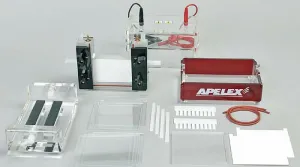 The MiniVertigel 2 by APELEX is a versatile gel electrophoresis system engineered to handle up to two gels of 0.8mm thickness in a configuration measuring 10 x 10 cm. Freshly manufactured, this piece of equipment is delivered in its original packaging, identified by Reference: 400000 and comes complete with a casting base. It allows for gel dimensions of 9 x 8.5 cm (L x H), utilizing glass plates of 10 cm x 8-10 cm height. Designed to facilitate consistent performance, the system operates at a constant current range from 15 to 30 mA per gel and a voltage spectrum of 150 to 300 Volts, achieving migration times between 30 to 60 minutes. An ideal choice for professionals seeking efficiency in protein and nucleic acid analysis.