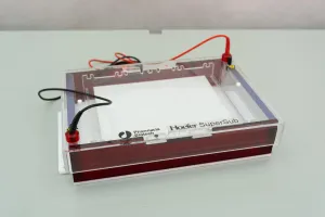 The Pharmacia Biotech Hoefer Supersub HE100 Gel Electrophoresis Unit is designed for electrophoretic separation of nucleic acid fragments in agarose gels. It accommodates gels sized 20 cm wide by 25 cm long with thickness between 3 and 7 mm and supports up to 20 wells. Fragment visualization is done using ethidium bromide staining under UV light.