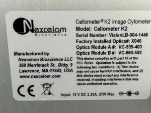 The Nexcelom Cellometer K2 Image Cytometer is a compact and automated instrument designed for precise and reproducible cell counting and analysis across diverse cell types. Operating with a broad voltage range of 100–240 V and frequency compatibility of 50/60 Hz, this model integrates advanced digital imaging technology to support applications in biotechnology, molecular diagnostics, and bioprocessing workflows.