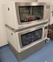 This offering features a stack of two Eppendorf Innova S44i Shaking Incubators, both in excellent working condition and prepared for immediate deployment. The Eppendorf Innova S44i is renowned for its adaptability and spacious design, tailored to suit sophisticated laboratory environments. It integrates cutting-edge technology and precise controls, rendering it perfect for a variety of laboratory applications, particularly in cell culture and microbiology.