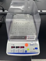 The Fisherbrand Incubating Mini Shaker by Thermo Fisher Scientific is a benchtop laboratory instrument designed for precise shaking and incubation of samples, making it essential for workflows in molecular diagnostics, bioprocessing, and synthetic biology research. It incorporates a perforated metal platform and a clear plastic incubating cover to ensure uniform temperature control and protection of samples during agitation.