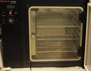 Oven Gallenkamp, type INC 200. With forced convection. Nominal temperature: 105ºC. Technical Specifications: 220 V, 50 Hz, 3 A. Exterior dimensions (D) x (H) x (B): 53 x 64.5 x 78.5 cm. Inner dimensions (D) x (H) x (B): 37 x 48 x 40 cm.