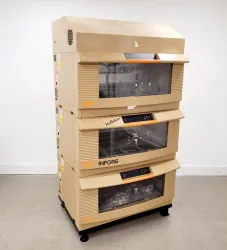 The Infors Multitron II Triple Stack Shaking Incubator, originally part of a university laboratory setup, is now available as a spares or repair item. These incubators are in good cosmetic condition, with minor wear typical of regular use. The system comprises three units: the top and middle units are operational but require replacement CO₂ sensors (GMP251 is recommended) for full functionality. The bottom unit necessitates replacement of blower motors and the rear cooling fan to become fully operational. While the shaker plate throw remains undetermined, both middle and top units have demonstrated reliable operation at 250 rpm.