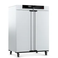 The Memmert IN750 Natural Convection Incubator 749L, 115V provides an expansive 749 L (26.5 cu.ft.) chamber, perfect for applications needing precise temperature regulation. Operating from +20°C to +80°C and capable of maintaining settings as low as 5°C above ambient, it features the user-friendly ControlCOCKPIT with SingleDISPLAY and high-definition TFT display for adjusting temperature (Celsius or Fahrenheit), air flap position, and timer. Its fully insulated stainless steel door includes an inner glass pane with a 2-point compression lock for visibility and safety. Natural convection and a pre-heated fresh air admixture ensure consistent chamber conditions, while AtmoCONTROL software enables efficient data management. Built for durability, it accommodates up to 14 shelves with a max load of 661 lbs, making it ideal for demanding lab settings.