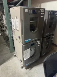 The New Brunswick Scientific Innova 42 Double Stack Incubator Shaker is designed for precise temperature control and shaking of biological samples. It features two vertically stacked incubator shaker units, each with independent controls and a clear observation window. The units are suitable for cell culture, fermentation, and other laboratory applications requiring controlled incubation and agitation.