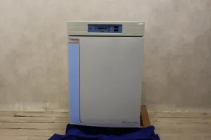The Thermo Scientific 3121 Water-Jacketed CO₂ Incubator offers precise environmental conditions with a temperature range from ambient +5°C to 50°C. It features exact temperature control with ±0.1°C and uniformity at 37°C within ±0.2°C. The CO₂ concentration is adjustable between 0 to 20%, maintaining superior control better than ±0.1% and readability at 0.1%. It supports relative humidity up to 95% at 37°C, inside a 184-liter capacity polished stainless steel chamber. The water jacket volume is typically 44 liters, maxing out at 49 liters. With interior dimensions of 541 x 681 x 508 mm and external dimensions of 668 x 1003 x 635 mm, its weight is 120 kg before filling the water jacket and 165 kg when operational.
