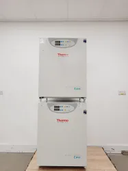 The Thermo Scientific BB 15 Function Line Double Stack CO₂ Incubators are advanced pieces of laboratory equipment designed for precise control of temperature and environment, ideal for cell and tissue culture applications. Removed from a university setting due to surplus, both units remain in good cosmetic condition, though the copper lining displays the typical discoloration characteristic of copper. They have been thoroughly tested and have shown to perform as expected. The testing included achieving a minimum temperature of approximately 18ºC, calibration at 37ºC and 5% CO₂ through an overnight run, and a maximum temperature of 55ºC. For optimal performance, re-calibration is recommended post-installation.