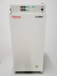 The Thermo Scientific Cytomat 2 C-LIN is an automated CO2 incubator designed for precision and consistent cell culture environments. This unit, which was decommissioned from a university lab due to being surplus, is fully functional and has undergone professional servicing. A comprehensive service report is available upon request. It is in good cosmetic condition with minor signs of usage. Included with the unit are two plate racks accommodating 21 shallow plate spaces each, a length of CO2 hose, an instruction manual, a software documentation manual, a configuration CD, and keys for both the door lock and power switch.