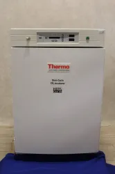 The Thermo Scientific Steri-Cycle Model 381 Incubator offers a temperature range from ambient +5°C to 50°C, ensuring precise temperature control for your samples. It maintains a relative humidity of less than 90% at 37°C, with a water pan as its humidity source. The unit boasts a polished stainless steel chamber and a total capacity of 184 liters, providing ample space for various applications. The interior dimensions are 508 x 541 x 681 mm, and the overall dimensions measure 635 x 668 x 1003 mm. With a weight of 118 kg, this robust incubator has been retrofitted to function as a normal incubator due to a defective CO₂ module, making it suitable for a range of laboratory environments focusing on humidity and temperature control.