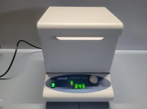 Introducing the LABNET Vortem 1550 Shaking Incubator, a state-of-the-art instrument designed for precise sample incubation under controlled conditions. This brand-new, never-used unit is equipped with racks accommodating both 50 mL and 15 mL tubes. The incubator operates at 230V and offers a temperature range from ambient +5°C to 99°C, with an accuracy of ±0.5°C. Its speed can be adjusted between 200 and 900 rpm with a consistent 3mm circular motion. The unit features a timer from 1 to 99 minutes or can function continuously. It has a capacity of holding 18 x 15 mL tubes or 8 x 50 mL tubes and dimensions of 10.2 x 12.2 x 12.2 inches (26 x 31 x 31 cm), making it compact yet efficient for laboratory environments.