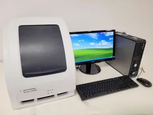 The Agilent Technologies Stratagene MX3000P System, complete with installed MxPro software, is a reliable real-time PCR system previously utilized in a university laboratory. It is in excellent cosmetic condition and fully operational, evidenced by its intact power-on state. With a lamp utility logged at 1823 hours and 49 minutes, this system remains well-suited for extensive molecular biology applications. The accompanying PC runs on Windows XP for streamlined operation and data management.