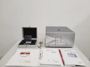 The Tecan Infinite F200 is a precision fluorescence microplate reader that comes equipped with software to enhance your laboratory's analytical capabilities. Previously part of a university lab, this unit was deemed surplus. While it powers on, indicated by the green light and operational cooling fans, further testing wasn't conducted due to the absence of a control PC. The device remains in excellent cosmetic condition, with assurances from the previous owner regarding its operational status before removal. The package includes a data cable, Tecan Magellan V7.0 software disc, user guide, and a software reference guide, all housed in a small Tecan hard case. Accessories also comprise a filter holder with one filter (No. 30019916 03 1227719), a packet of small plastic filter holder fittings, a Rubis K6 tweezer set, a fitting tool, and a flat plate.