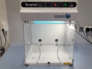 The ERLAB Biocap RNA DNA Dynamic PCR Hood is optimized for performing sensitive assays. It includes HEPA H14 filtration (note: filter replacement not required) and features a vertical laminar flow system for contamination control. Measuring 600x601x565 mm internally, it incorporates a UV lamp with a timer for added protection. Powered by a 230 V, 50 Hz supply and consuming 26 W, the hood also features transparent acrylic walls—exercise caution due to the presence of microcracks (refer to photographs) with a thickness of 10mm. The total electrical power usage stands at 73W.