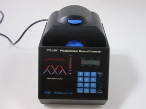 The MJ Research PTC-100 Thermal Cycler is a precision laboratory instrument designed for PCR amplification and thermal processing of samples in both 96-well and 60-well microplates. It features a broad thermal range from 0°C to 105°C with high accuracy of ±0.3°C and excellent well-to-well thermal uniformity of ±0.4°C, critical for reproducible results in molecular biology and biotechnology workflows.
