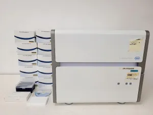 The Roche LightCycler 480 II Real-Time RT-PCR Machine was removed from a university lab as it was surplus to requirements. While the unit powers up, it exhibits errors during installation, specifically "100900270 - Restart instrument" and "100600130 - Command not allowed," likely caused by the former error. Images of these errors are available, but the computer is not included. The lamp's absolute intensity is 9853, with an operation time of 572 hours. The machine is in good cosmetic condition, with minor marks from use, and is offered for spares or repairs. Included accessories are:
