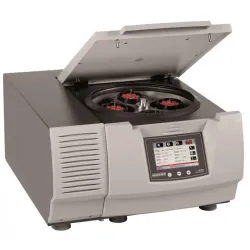 The Ortoalresa Consul 22R is a sophisticated benchtop centrifuge designed for high performance and reliability in laboratory settings. It offers a remarkable cooling feature with a maximum capacity of 4 x 400 mL, achieving speeds up to 14,300 rpm and a relative centrifugal force of 21,948 xg. Equipped with a TFT colour touch screen, this centrifuge provides clear indications of rpm, rcf, and time. It includes programmable features such as acceleration/braking, and speed adjustments in increments of 10 rpm or 10 xg. Users can set operation intervals ranging from 1 second to 99 hours, as well as select indefinite periods of run time. Enhanced with controllable acceleration and braking, the unit features 40 memory slots for ease of operation. The Consul 22R boasts a noise level of less than 60 dB and is powered by a maintenance-free engine. Note that the rotor is not included; please refer to the description or attached files for available options.