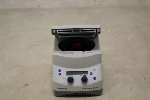 The Eppendorf 5424 Centrifuge is engineered for precision and efficiency in microcentrifugation applications. It provides a variable speed range from 100 to 14,680 rpm, adjustable in 50 rpm increments, allowing for finely tuned operation. The device offers a relative centrifugal force (RCF) spectrum from 1 to 20,238 x g, adjustable similarly in 50 x g increments. Users can set run times from 30 seconds up to 9 hours and 59 minutes, with 0.5 minute increments up to 10 minutes and 1 minute increments thereafter, ensuring flexibility for various experimental needs. Measuring 236 x 320 x 227 mm and weighing 13.4 kg, the centrifuge is equipped with an Eppendorf FA-45-24-11 fixed-angle rotor, capable of reaching a maximum speed of 15,000 rpm. It accommodates up to 24 micro test tubes with capacities of 1.5/2.0 ml, making it an essential tool for laboratories handling small sample volumes.