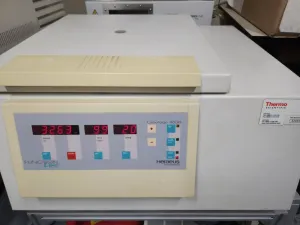 Presenting the Heraeus Labofuge 400R, a pre-owned refrigerated centrifuge that offers reliable performance for various laboratory needs. This unit is capable of accommodating up to four 100ml samples, providing a suitable solution for medium-sized volume requirements.