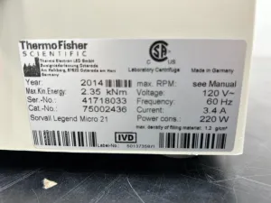 The Thermo Fisher Sorvall Legend Micro 21 is a precision laboratory microcentrifuge engineered for efficient sample separation in molecular diagnostics, biotechnology, and synthetic biology research. Designed for benchtop operation, this microcentrifuge operates with a power consumption of 220 W at 120 V and 60 Hz, delivering reliable performance essential in biopharmaceutical production pipelines and molecular cloning workflows.