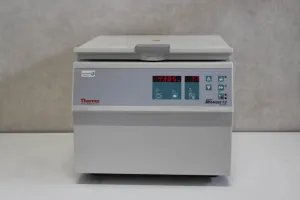 The Thermo Heraeus Megafuge 1.0 is a high-performance laboratory centrifuge designed for precision and efficiency. It offers a maximum speed of 6000 rpm and a maximum relative centrifugal force (RCF) of 6,240 x g, ensuring reliable separation results. This centrifuge features a maximum kinetic energy of 26 kNm, and its running time is adjustable from 1 to 99 minutes, with continuous operation capability.