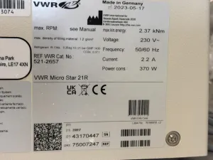 Optimized for applications in live-cell imaging preparation, fluorescence analysis sample prep, and other specialized biotechnological processes, the VWR Micro Star 21R is essential equipment for laboratories focused on clinical diagnostics, cell imaging, and biomedical engineering research requiring refrigerated centrifugation with reliable thermal management.