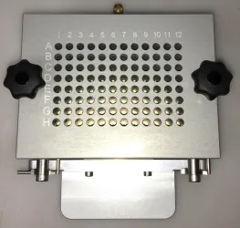 Aliquots are aspirated via vacuum into 96 cylindrical holes on a metal perforated plate