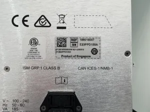 Technical specifications include a voltage range of 100–240 V, 50–60 Hz frequency, and power consumption of 185 VA. Manufactured in Singapore, this system is compatible with the Waters Acquity Flex Cart accessory to facilitate mobility in laboratory environments.