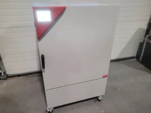 The BINDER KBF 240 laboratory climate chamber is designed for precise environmental control, featuring a 240-liter capacity and a temperature range between 0°C and +70°C. It maintains humidity levels from 10 to 80% RH and offers temperature uniformity of +/- 0.2°C at 40°C, with exceptional thermal stability of +/- 0.1°C. With a robust stainless steel interior and a convenient water supply kit, this unit ensures efficient steam humidification via a capacitive humidity sensor. The chamber is mounted on casters with brakes, making it easily mobile. Its 2.1kW power supply operates at 230V, supporting up to two stainless steel shelves with a max load of 30 kg each. Built in 2019, the chamber has been tested under various temperature and humidity conditions, confirming its excellent operational status. The external dimensions measure 1460 x 925 x 800 mm, while the internal dimensions are 785 x 650 x 485 mm, and it weighs 195 kg.
