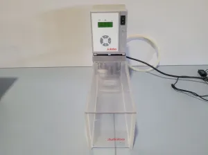 The JULABO ED Thermostat Bath with Immersion Thermostat is engineered for precise temperature control in the laboratory. It features a durable plastic container with dimensions of 400 x 135 x Ht 160 mm and is equipped with an efficient circulation pump to ensure uniform heating. The device can achieve temperatures up to 100°C and operates on a 230 V electric supply. Its compact design, with overall dimensions of 500 x 140 x Ht 355 mm, makes it an excellent choice for laboratories with space constraints. This model, manufactured in 2010, continues to be a cornerstone for accurate and reliable heating applications.