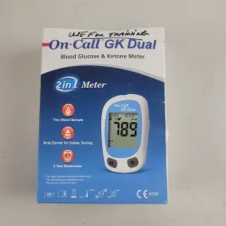 This listing features an unused Acon On Call GK114-13B dual blood digital meter. The unit is new and ready for immediate use. It offers dual testing capability, measuring both blood glucose and ketone levels. Its memory storage can hold up to 450 test results, complete with date and time. Results are displayed in either mg/dL or mmol/L, based on regional standards. The device allows setting up to five test reminders to support regular monitoring efforts. For accuracy, it supports quality control testing using On Call control solutions. It operates on two user-replaceable CR2032 coin cell batteries.