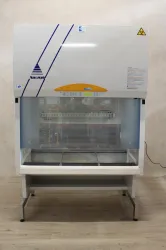The Kojair BioWizard Golden GL-130 Biological Safety Cabinet features a slanted electrical front window designed for ergonomic ease and efficient operation. It is equipped with plugged holes in the side windows, ensuring optimal safety and containment. Dual power sockets are also integrated for convenience. The cabinet includes a UV light with a magnetic fastening feature, adding a layer of sterilization. It maintains a consistent airflow of 0.45 m/s, with a recirculation air volume of 965 m3/h and an exhaust air volume of 383 m3/h, culminating in a total air volume of 1348 m3/h. The cabinet's external dimensions are 1280 x 840 x 1380 mm, while the internal workspace measures 1190 x 600 x 665 mm. Supported by a frame height of 800 mm, it retains a solid construction with a weight of 281 kg, ensuring stability and reliability in high-demand laboratory environments.