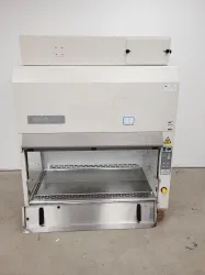 This Labcaire BH12 Class II Biological Safety Cabinet was decommissioned from a university lab due to surplus. Though last operated three years ago, it remains in working order with operational fans and white lights. Note, the UV light is not installed. The cabinet is in acceptable cosmetic condition, albeit with the lower metal cover missing its latches, resulting in an imperfect fit. Internal dimensions measure D62.5 W120 H70 cm, with a usage hour count of 14001.4.