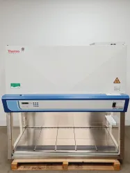 The Thermo Fisher Scientific Class 2 Safe 2020 1.5 Biological Safety Cabinet offers advanced protection for laboratory environments. Previously utilized in a university lab, this model is now available due to changing requirements and remains in excellent working order. The cabinet's features include a functional fan, consistent airflow, reliable UV and white lighting, and operational window adjustments. With a spacious working area of 64 x 120 cm, it is well-suited for various laboratory applications. The unit comes with a manual and a stand, ensuring ease of setup and use. Some minor cosmetic imperfections are present due to its previous use.