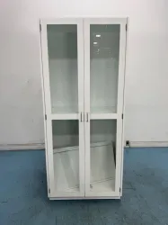 The glass door laboratory display cabinet features a durable white frame with two hinged, glass-paneled doors equipped with metal handles for secure closure. Designed as a static storage and display unit, it lacks electrical components, making it suitable for storing laboratory instruments, glassware, and consumables in clinical diagnostics, biotechnology, and bioprocessing environments.