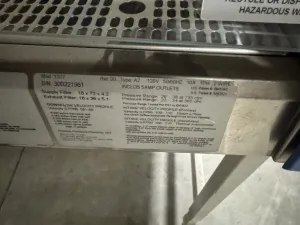 Description: Model 1377. Serial No.: 300221961. Manufactured: 2018. Voltage: 120V. Frequency: 50/60Hz. Power Consumption: 110W. Fuse Rating: 2 Amp. Includes 5 AMP outlets. Configuration includes Type A2 biosafety cabinet with a 6-foot work area. Electrical supply is single phase. Software version: N/A.