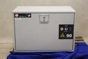 The Asecos UB90.060.089.S is designed to provide optimal safety for the storage of hazardous materials. This fire safety cabinet features a minimum exhaust air rate of 2 m³/h with a tenfold air exchange, ensuring minimal pressure difference of just 1 Pa. Achieving a 30-fold air exchange at 10 m³/h, it maintains efficient ventilation. It supports a floor load of 313 kg/m² and a maximum loading capacity of 300 kg. With each drawer capable of holding up to 50.00 kg and collecting up to 20.00 litres, it offers practical storage solutions. The cabinet's external dimensions are 893 x 574 x 600 mm, while the interior measures 771 x 452 x 502 mm, and its total weight stands at 168.5 kg.