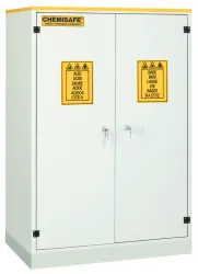 The CS120 BASIC PVC CHEMISAFE cabinet manages the storage of non-flammable hazardous liquids with compliance to EN61010-1 and standardized ISO 3864 safety pictograms, prioritizing workplace safety and chemical resistance.